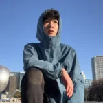青い空の下、都市のビル群を背景に、青灰色のフード付きジャケットと黒いパンツ、青いランニングシューズを履いた若い男性が屋外で走っている姿。右側にはオレンジ色のテキストボックスがあり、「【ランニングフォーム改善案】 失速ゼロでタイム更新! 僕が考えたスライドピッチ走法完全ガイド」という日本語が書かれている。